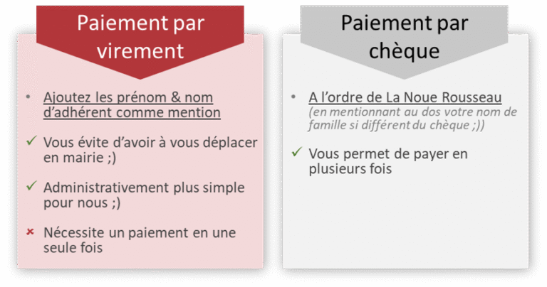 Vous pouvez payer par virement ou par chèque avant le 06 septembre 2025 (les chèques sont prélevés au mois d’octobre et de janvier). Merci de les déposer dans la boîte aux lettres de la mairie, à notre intention.
